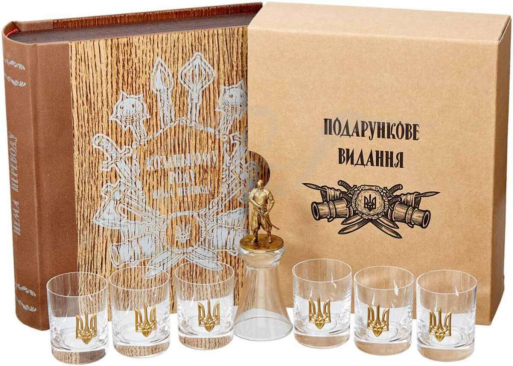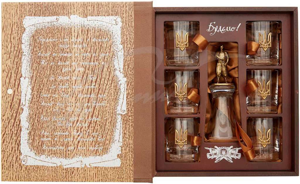 Подарунковий набір склянок "Козацькому Роду Нема Переводу" стане чудовим подарунком цінителям якісних та красивих виробів. Він може стати прикрасою в серванті або на книжковій полиці. Упаковка у вигляді старовинної книги виконана з дуба. На внутрішній стороні кришки (обкладинки) нанесений вірш українською мовою. На титульній стороні гарне гравіювання з назвою набора. Склянки оздоблені елементом державного герба вільної країни України. У набір входить сьома штрафна чарка, яку не спустошивши не можна поставити на стіл.