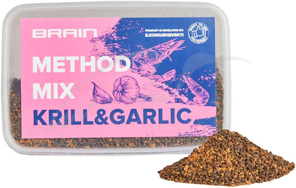 Метод Микс Brain Krill & Garlic имеет комбинированный аромат, состоящий из криля и чеснока. Основу прикормки составляет пеллетс диаметром 1.5-2 мм из рыбной муки, а в качестве мелкой фракции добавлена крилевая мука, выступающая связующим элементом во время облепливания кормушки. Особого запаха смеси придаёт экстракт чеснока, который выделяет прикормку на общем фоне водоёма.