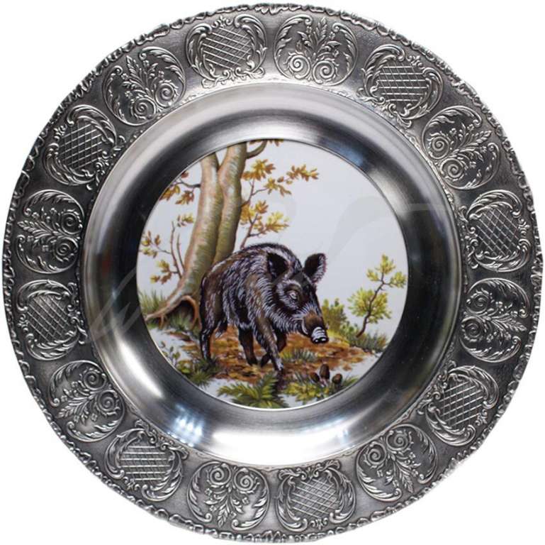 Декоративна тарілка Artina SKS Кабан – стане додатковою окрасою інтер'єру. Вона виготовлена з нетоксичного та одного із семи найдревніших матеріалів – олова. У центрі посудини розміщена барвиста картинка дикого кабана, з обох боків прикрашена вишуканим опуклим малюнком. Тарілка Artina SKS Кабан стане чудовим подарунком мисливцеві.