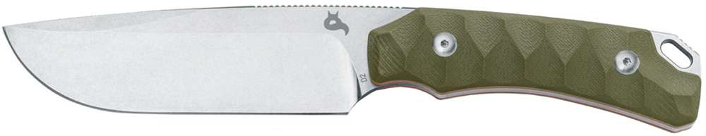 Массивный клинок ножа профиля Drop Point выполнен из инструментальной стали марки D2 закаленной до твердости 59-61 HRC, которая характеризуется хорошей стойкостью к коррозии. Клинок с вогнутыми спусками и усиленным острием весьма удобен для выполнения EDC-задач.