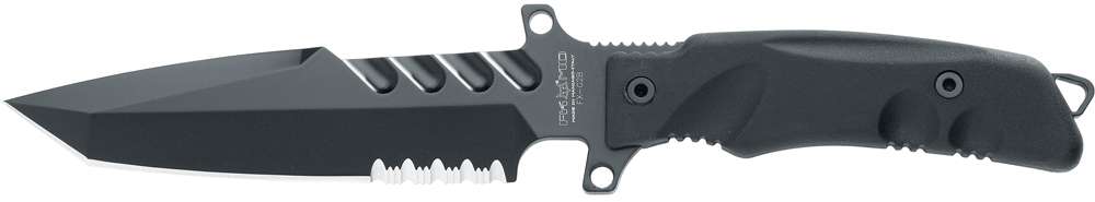 Predator I- крепкий нож с фиксированным клинком для активной самообороны. Агрессивный внешний вид подтверждается надежными используемыми материалами. Мощный клинок толщиной 6 мм изготовлен из стали N690Co, выплавленной фирмой Bohler, известнейшим австрийским производителем прокатной стали. Эта сталь намного более коррозиеустойчива, чем 440C, VG-1, VG-10, 154 СМ, AUS-10 или S30V и гораздо лучше затачивается. При этом, на нее нанесено тефлоновое покрытие, обеспечивающее еще большую долговечность. Рукоятка также изготовлена из коррозиеустойчивого материала – эластополимера Forprene®, не «боящегося» солёной воды и температур от -40°С до +150°С. Нож комплектуется тактическими ножнами из Кордуры и могут крепиться на бедро или на любой объект системы MOLLE. В пользу этого ножа говорит тот факт, что Predator I стоит на вооружении Brigada de Operaciones Especiales “Lautaro” (спецвойска Чили).
