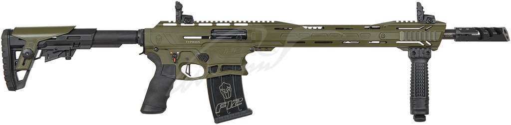 Typhoon F12 – инновационное полуавтоматическое ружье 12 калибра с газоотводной системой перезарядки. Отличительно, что F12 выполнено в компоновке платформы AR и практически полностью повторяет её органы управления, предоставляя возможность стрелкам-практикам применять уже отработанные на «черных» винтовках навыки обращения с оружием.