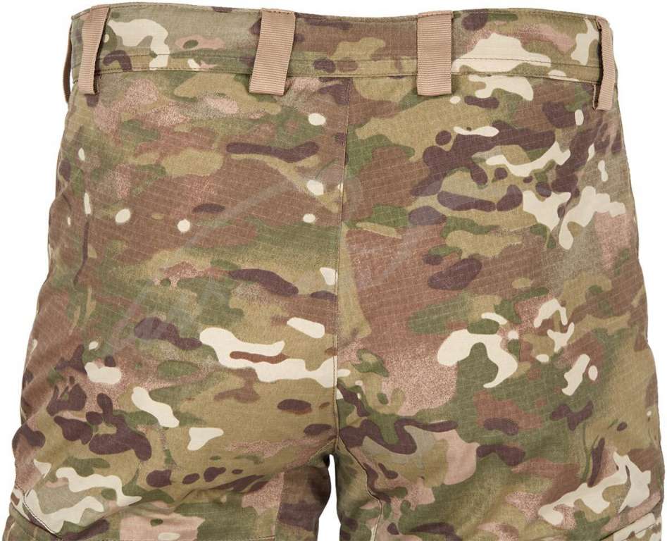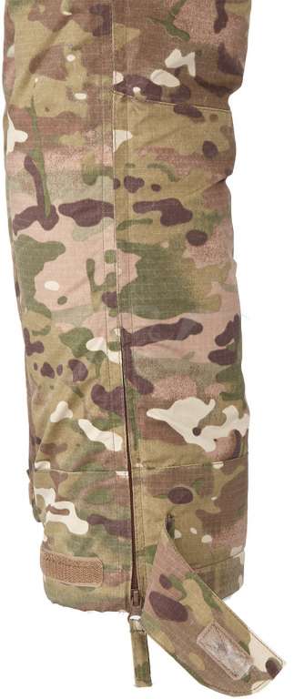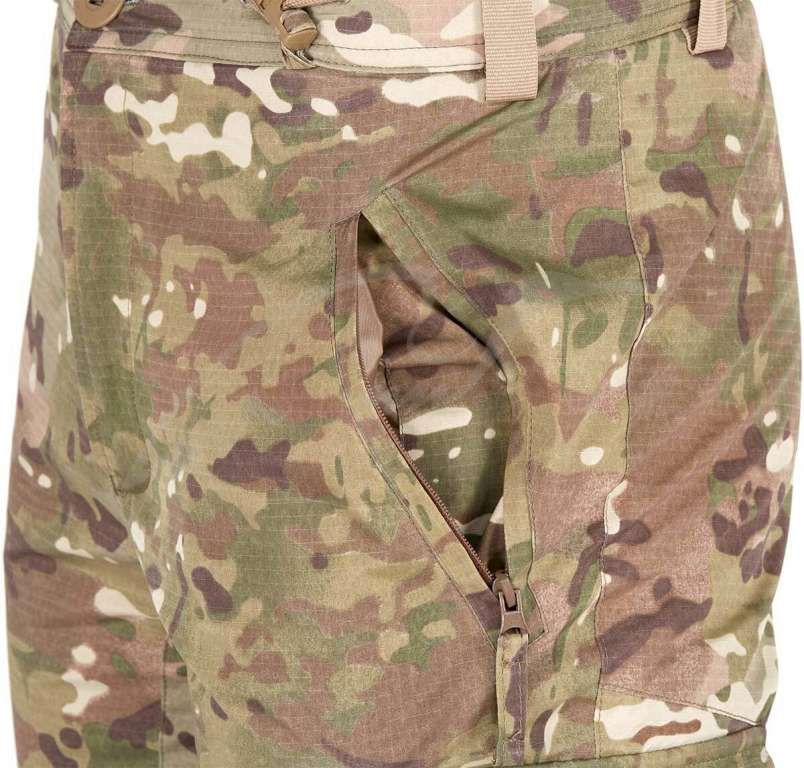 Брюки оборудованы нейлоновыми шлевками для ношения ремня и встроенной стропой с фиксаторами для регулирования объема талии. Внизу штанин размещены клапаны на липучках и эластичной стропой с фиксатором для регулирования плотности прилегания.