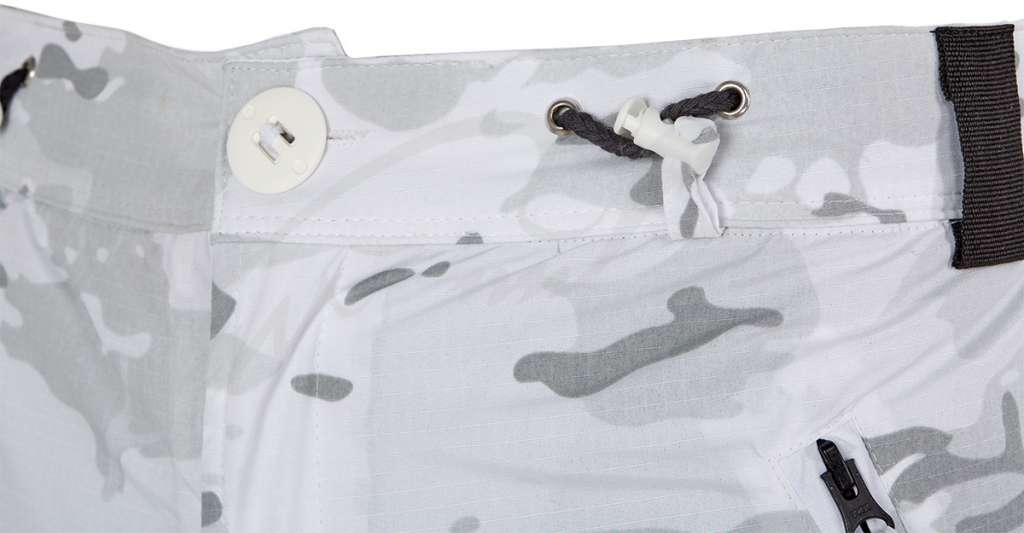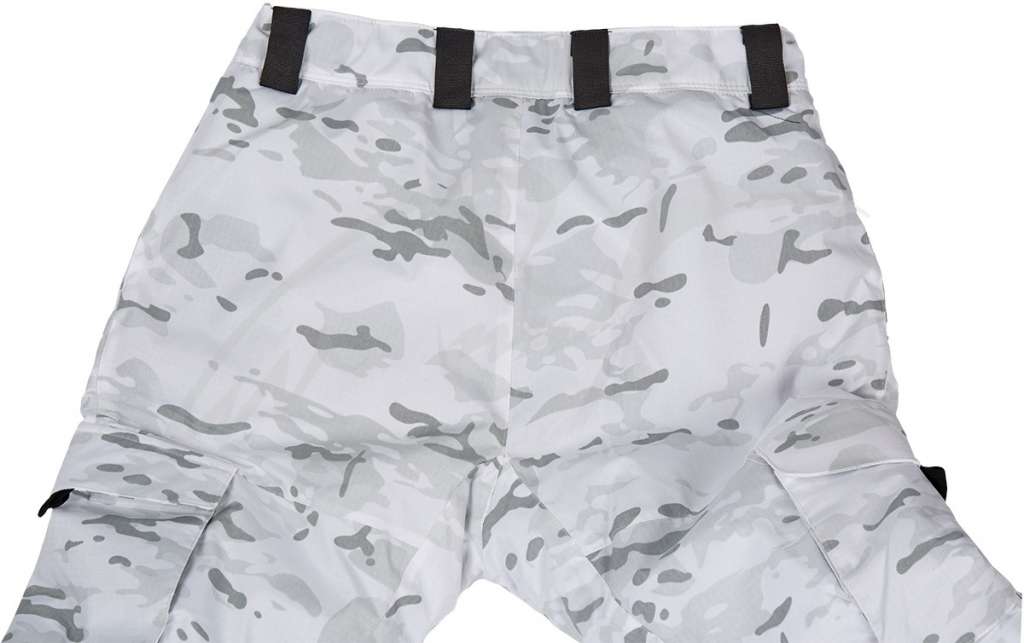 Брюки оборудованы нейлоновыми шлевками для ношения ремня и встроенной стропой с фиксаторами для регулирования объема талии. Внизу штанин размещены клапаны на липучках и эластичной стропой с фиксатором для регулирования плотности прилегания.