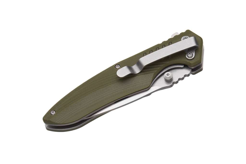 Сталева кліпса, розташована з правого боку рукояті, дозволяє надійно закріпити ніж на зрізі кишені.