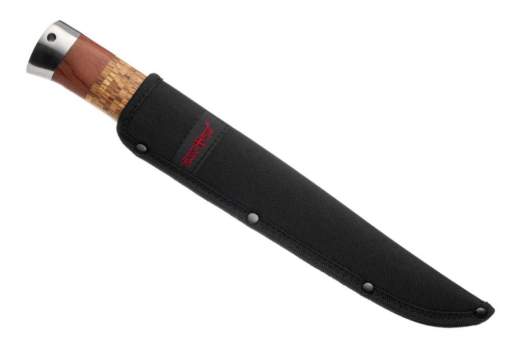 Руків'я ножа має овальний переріз та помітне “черевце” у ниджній частині, що забезпечує стабільне та надійне утримання. Деревина, використана для руків'я,гарно оброблене та приємне на дотик навіть в умовах екстремальних температур. Саме руків'я зі смаком набране з різних порід цінної деревини. Вигідне гармонійне поєднання різних кольорів та фактур дерева служить справжньою прикрасою руків'я та ножа загалом.