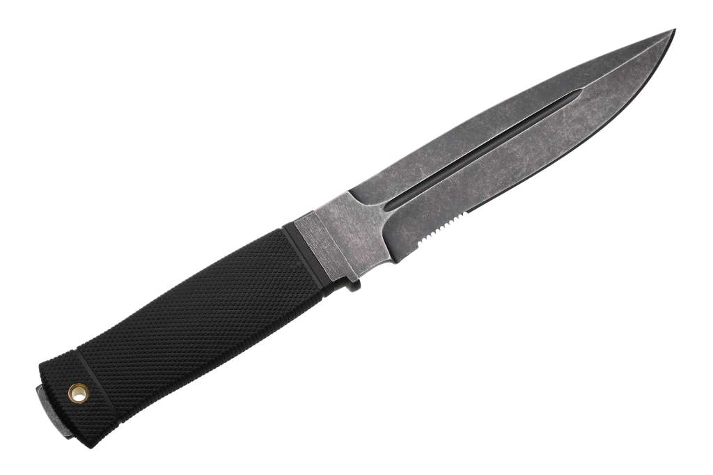 Нож оснащен довольно крупным и мощным клинком типа Drop Point c понижением линии обуха. Остриё лезвия находится на оси приложения силы при уколе, такой клинок одинаково хорошо режет и колет. Клинок имеет фальшлезви на обухе, которое образованно спусками без заточки. Фальшлезвие помогает клинку при уколе входить в разрезаемый материал. Толщина клинка в 5 мм, центральные долы, предназначенные для увеличения прочности клинка – все это говорит о том, что при проектировании ножа учитывались будущие нелегкие условия эксплуатации. Феноменальная прочность ножа обеспечивается тем, что лезвие и хвостовик выполнены из единой полосы стали. Лезвие ножа изготовлено из стали 440С, очень популярного и достойного ножевого материала. 440С - довольно твердая сталь, ножи из нее отлично режут и долго не тупятся. Клинок ножа имеет черное антибликовое покрытие, которое помимо своего основного предназначения — не создавать отблесков, будет служить дополнительной защитой от коррозии.