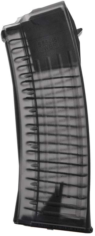 Магазин WBP для карабинов на платформе АК рассчитан на 30 патронов кал. 223 Rem/5,56x45 мм и имеет прочную полимерную конструкцию. Использование полимера позволяет существенно облегчить вес изделия, а его полупрозрачный корпус позволяет контролировать количество оставшихся в магазине боеприпасов. Пружина из нержавеющей стали и внутренняя геометрия предотвращают перекос патрона. Пятка магазина также стальная. Подходит для карабинов WPB Jack, Mini Jack, Beryl и Mini Beryl.