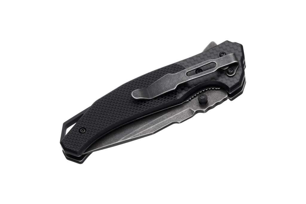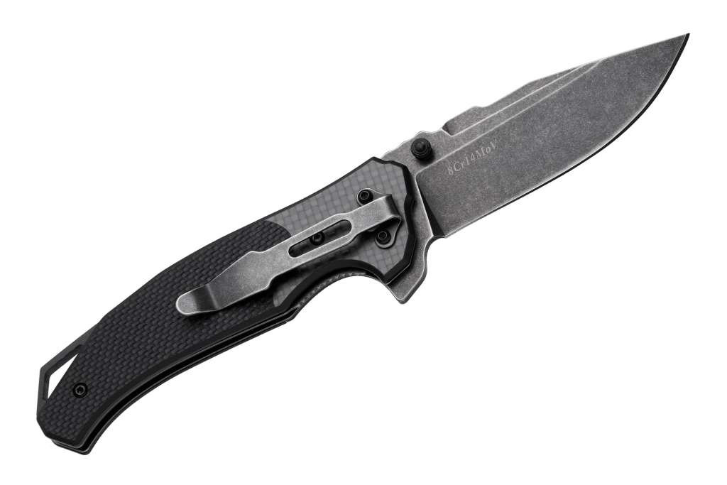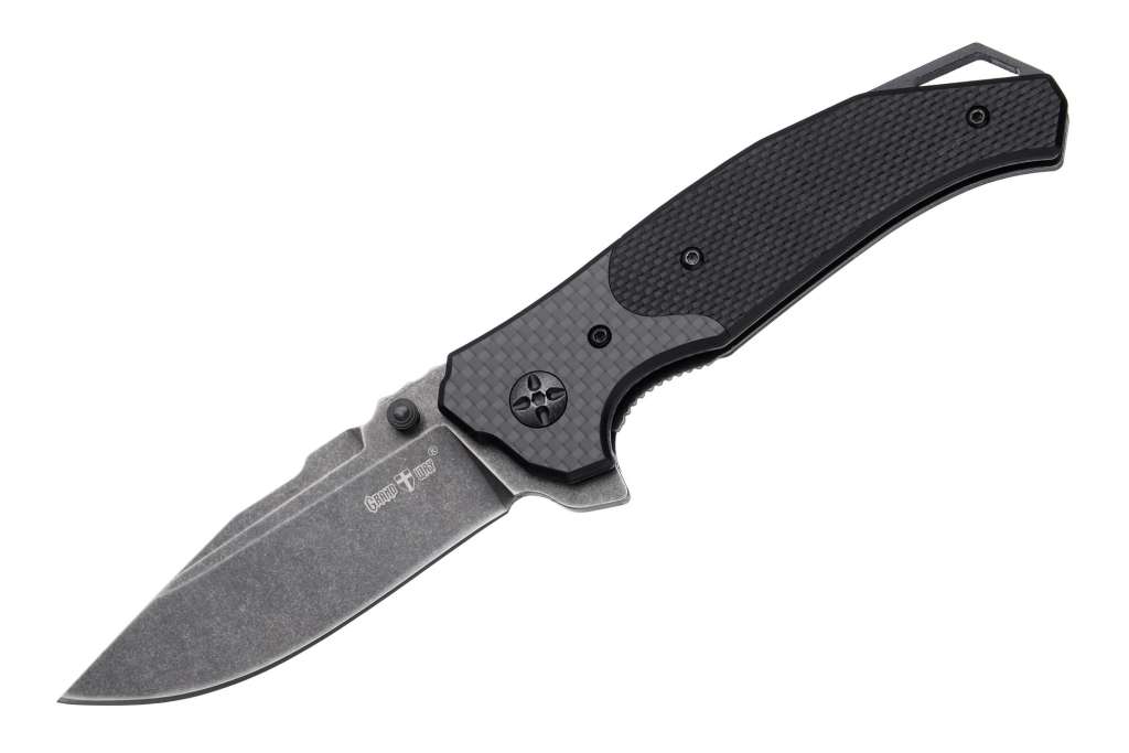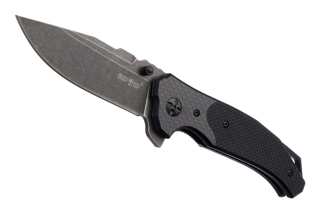 Grand Way WK 06211 – складаний ніж для щоденного використання, який має значні тактичні елементи у дизайні. Чорні карбонові накладки рукояті та чорний невідблискуючий клинок з якісної сталі 8Cr14MoV роблять цей ніж дуже серйозним та солідним на вигляд. І це не просто враження. Ніж справді серйозний.