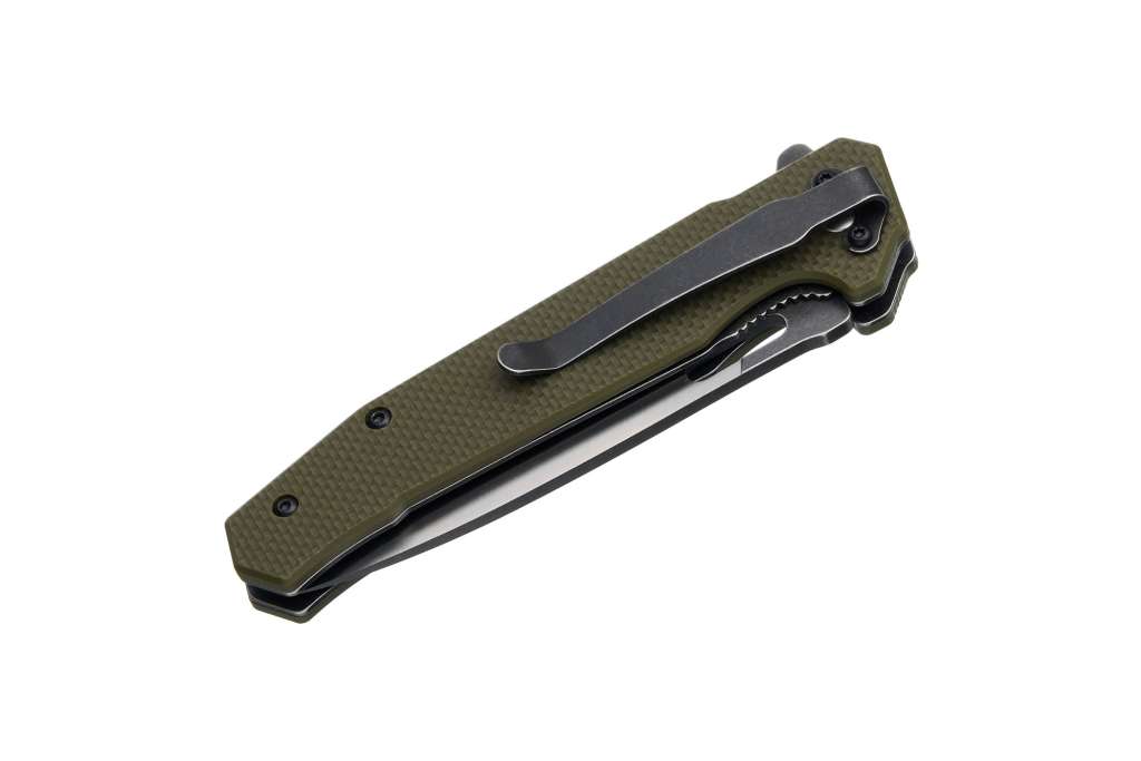 На підтримку цього стилю працюють його прямі, лаконічні контури, невелика ширина рукояті з накладками з G10 кольору хакі, акуратна кліпса з покриттям Black Stonewash.