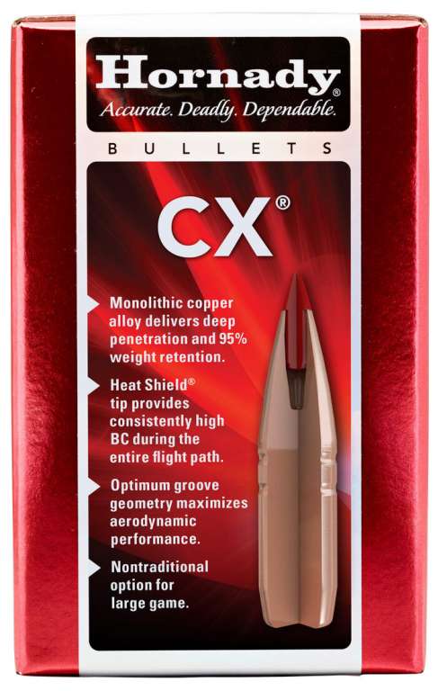 Охотничьи пули Hornady CX (Copper alloy eXpanding) имеют монолитную конструкцию и изготовлены из медного сплава. Используемый наконечник Hornady Heat Shield Tip, применяемый во многих других пулях компании, благодаря своей термостойкой полимерной конструкции может поддерживать высокий и стабильный баллистический коэффициент на протяжении всего полета пули. Канавки на пуле СХ оптимизированы для уменьшения сопротивления, что приводит к более длительному сохранению скорости на дальних дистанциях и большей передаче энергии цели. Пуля обладает высокой способностью глубоко проникать в цель с незначительной фрагментацией снаряда и обеспечивает сохранение массы в 95%.