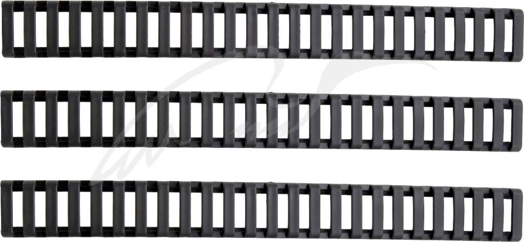 Захисна накладка ERGO PRO LADDER захищає планки від пошкоджень та захищає стрільців від наслідків контакту з краями планок. Запобігає пошкодженню шкіри, спорядження та одягу, які контактують з краями планок. Накладки мають прогумовану поверхню та низький профіль і розраховані на 25 слотів, але легко обрізаються для індивідуальної підгонки. Підходять для всіх планок Пікатінні. В комплекті 3 шт.