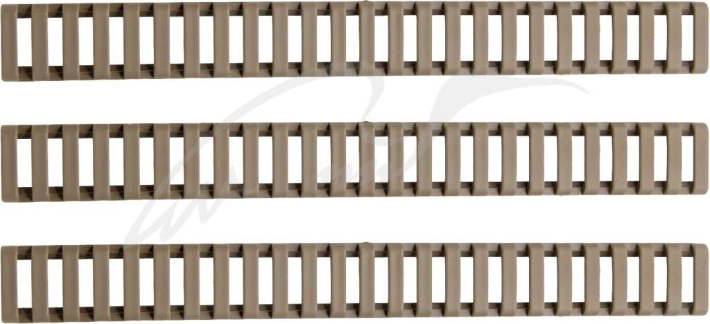 Захисна накладка ERGO PRO LADDER захищає планки від пошкоджень та захищає стрільців від наслідків контакту з краями планок. Запобігає пошкодженню шкіри, спорядження та одягу, які контактують з краями планок. Накладки мають прогумовану поверхню та низький профіль і розраховані на 25 слотів, але легко обрізаються для індивідуальної підгонки. Підходять для всіх планок Пікатінні. В комплекті 3 шт.