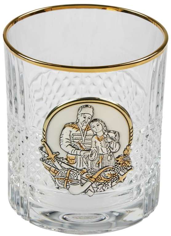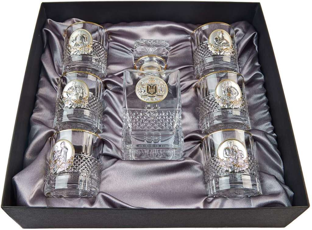 До набору входять шість склянок і графин, які декоровані золотими і срібними накладками з унікальним дизайном герба і зображень козаків. Накладки вкриті сріблом 925 проби та золотом 24 Кт з пробою 999, що надає склянкам і графину розкішного вигляду та підкреслює їхню високу якість.