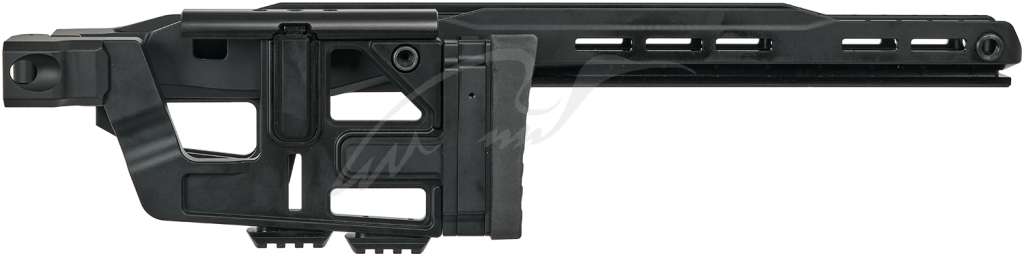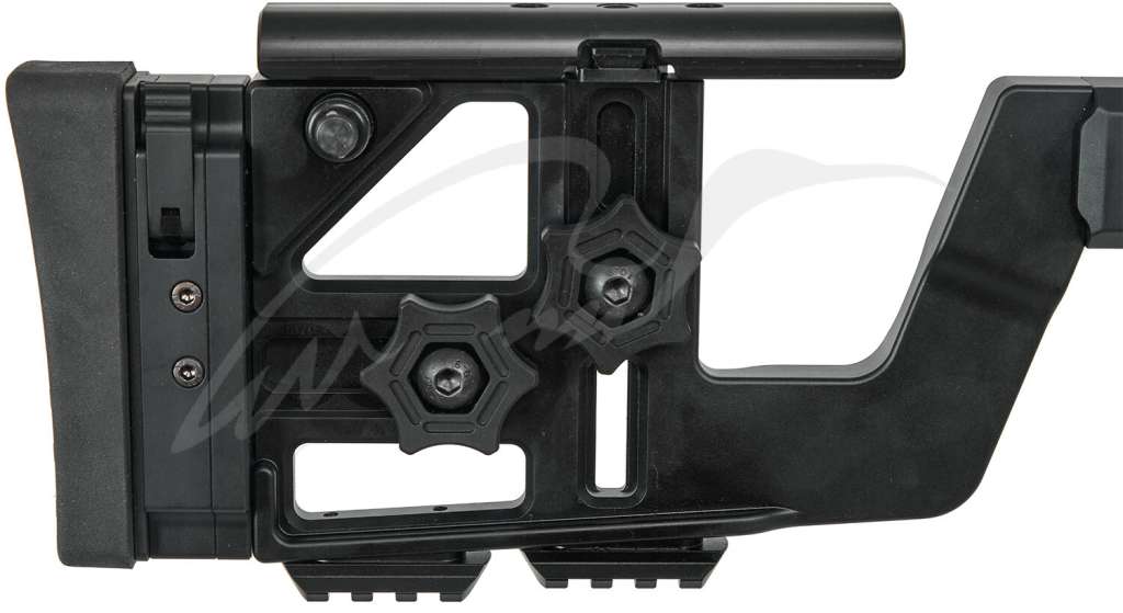 - Регулювання довжини приклада і висоти підщічника виробляються без використання інструментів. Підщічник виконаний з матеріалу Delrin з малою теплоємністю, а м'який потиличник має як регульовану висоту, так і регульований кут повороту відносно осі прикладу.