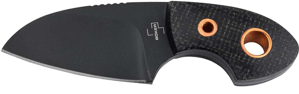 Нож с фиксированным клинком Boker Plus Gnome от Джаспера Вокснэ удивляет своей предельной компактностью и обеспечивает исключительный комфорт во врем ношения. Клинок профиля Sheepfoot, с черным титановым покрытием, изготовлен из прочной стали D2, поэтому этот малыш легко справляется с повседневными задачами. Для удобства использования, на обух нанесен ряд насечек для упора большим пальцем. Накладки на рукояти выполнены из микарты и украшены двумя полыми отверстиями с медными вставками, заднее можно использовать в качестве отверстия для темляка. Эргономика рукояти гарантирует отличный хват. В комплекте идут прочные ножны из Kydex и оснащены шариковой цепочкой для ношения на шее.