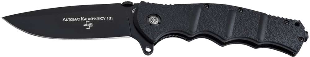 АК101 – мощный нож с клинком 10 см, хорошо подойдёт для охоты, походов и любых экстремальных ситуаций. Рукоять ножа благодаря своей форме, текстуре и наличию упора для большого пальца с насечкой обеспечивает уверенное и комфортное удержание ножа в любых условиях. Под накладками конструкция рукояти усилена за счет стальных пластин толщиной 1,5 мм. Выступ в основании клинка, флиппер, позволяет быстро открыть нож, а после открытия - играет роль гарды для защиты пальцев. Кроме флиппера клинок можно аккуратно открыть пальцем (даже в перчатке) при помощи специального упора – диска на обухе клинка. Клинок сделан из стали 440С или D2, его изогнутая форма с небольшим «брюхом» позволяет комфортно резать самые различные материалы. Для экстренных ситуаций в рукояти ножа установлен стеклобой. Замок ножа – «лайнер-лок», клипса позвроляет носить нож в кармане в положении остриём клинка вверх.