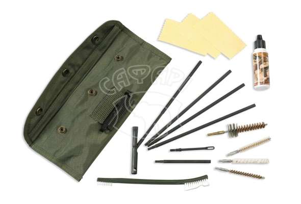 Набір для чищення, який поєднав мінімальну кількість необхідних засобів для чищення, які завжди можуть бути під рукою. У комплекті чохол з міцної тканини непромокальний, шомпол металевий розбірний з вішером, олія 25 мл, 4 йоржика в комплекті, ганчірки безворсні 3шт., універсальна щітка. Не вимагає особливих умов зберігання