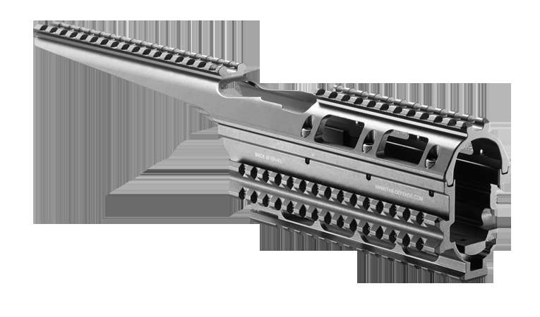 Цевье изготовлено фрезеровкой из цельных блоков авиационного алюминия, и анодировано. На цевье размещены 5 планок пикаттини (mil-std 1913) для установки аксессуаров, что делает его одним из самых вместительных решений для карабинов на базе АК. Цевье устанавливается аналогично штатному. Дополнительно нижняя часть цевья фиксируется двумя поджимными винтами. Верхняя часть цевья крепится к нижней 9 болтами под шестигранник, превращая цевье в монолитную конструкцию. Особенностью цевья является длинная верхняя часть, на которой расположены две планки пикаттини. Это позволяет устанавливать прицельные приспособления как на газоотводную трубку, так и ближе к глазу, над крышкой ствольной коробки. Таким образом, можно установить коллиматорный прицел с увеличителем, дневную или ночную оптику. Это решает проблему установки прицела ближе к глазу для стрелков, чье оружие не оборудовано боковой планкой «ласточкин хвост». Благодаря специальному вырезу в верхней части цевья, остается возможность использовать штатный целик при снятой оптике. Также сохраняется возможность разбирать оружие для чистки и обслуживания, не снимая прицельных приспособлений. Цевье имеет довольно значительный вес, поэтому для большего комфорта рекомендуется использовать рукоятку с интегрированными сошками T-POD.