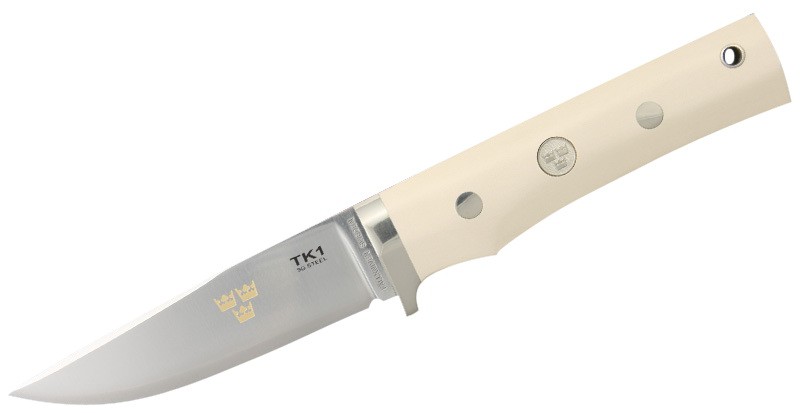 Рукоятка виконана з мікарти (micarta) - щільного матеріалу, виготовленого на основі синтетичної смоли, пофарбована в бордовий колір і декорована медальйоном. На медальйоні вигравіровано три корони – уособлення стилю, унікального дизайну та шведського престижу. Особливість ця пов'язана з тим, що виробник постачає свої унікальні вироби до королівського двору Швеції.