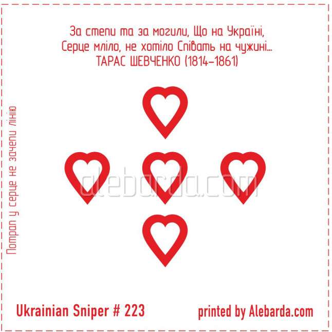 Мишень разработана совместно с Ukrainian Sniper для развлекательной, высокоточной стрельбы на дистанции 100м. Пораженной она считается в случае если незадета линия. Трудность ее поражения заключается в сложной форме самой мишени и расположении точки попадания не в центре масс. Размер зачетной зоны всего на один миллиметр больше калибра.