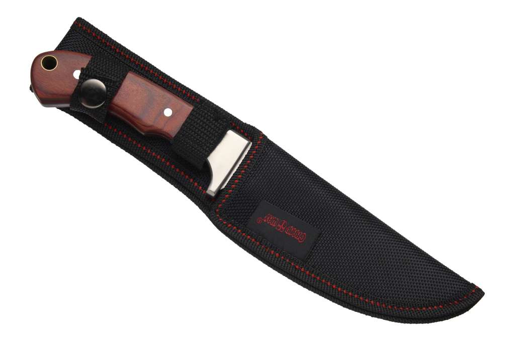 Зручне дерев'яне руків’я має конструкцію фултанг. Тобо – це заточена смуга нержавіючої сталі, на яку в районі рукояті наклали дерев'яні накладки. Подібні ножі давно славляться своєю винятковою надійністю.