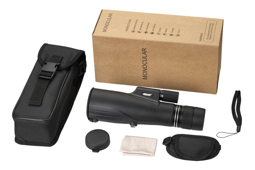 Багата комплектація та доступна ціна. Комплект постачання включає: монокуляр, тканинний чохол, серветку для очищення від пилу, захисні кришки для оптики та наручний ремінець для зручності перенесення.