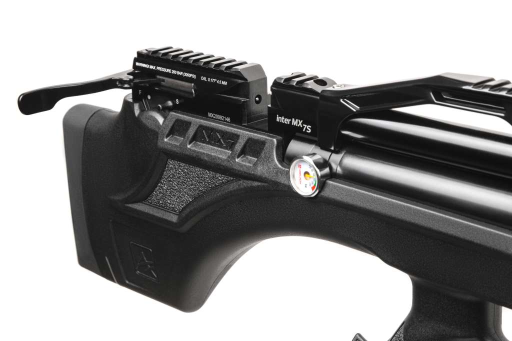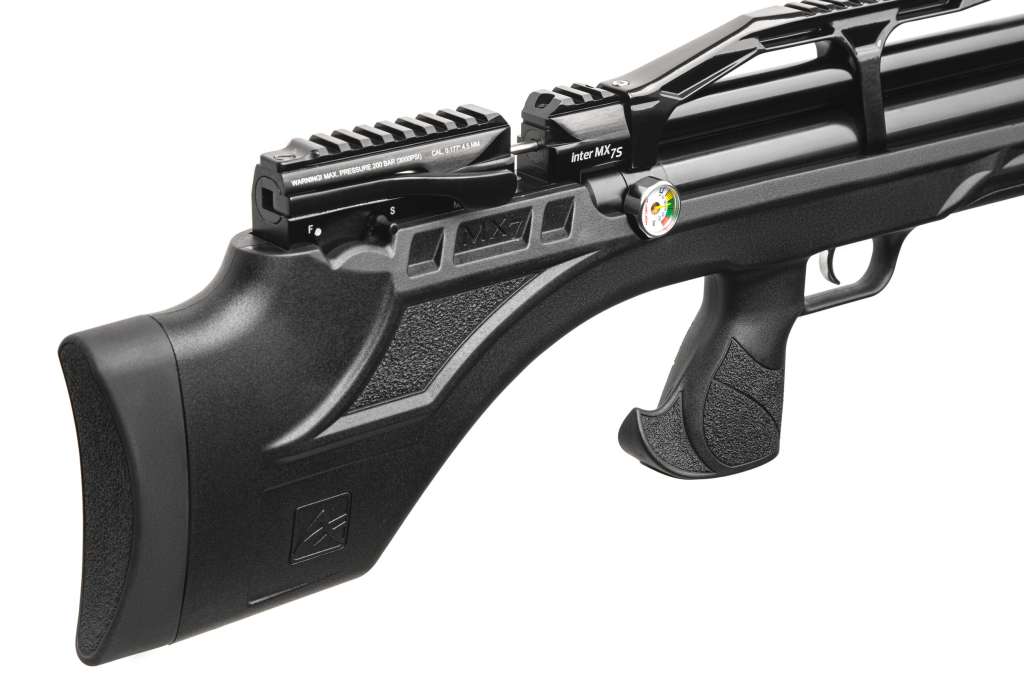 Пневматична PCP гвинтівка Aselkon MX7-S Black - укорочена версія моделі МХ-7. Ложе з регульованим підщічником, виконано з ударостійкого пластику, має м'який потиличник, що не тільки пом'якшує і без того незначну віддачу, але і забезпечує більш зручну вкладку, завдяки чому ви зможете вести більш кучну і прицільну стрільбу.