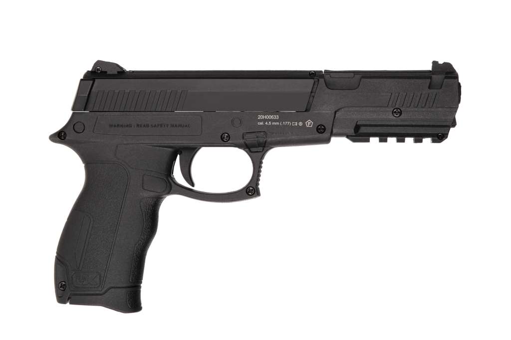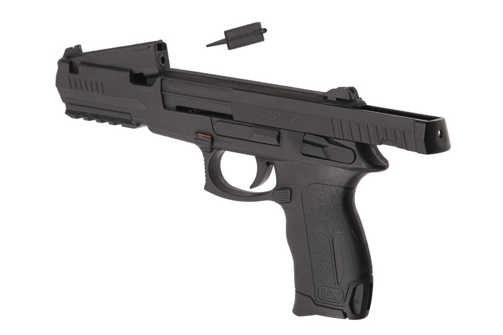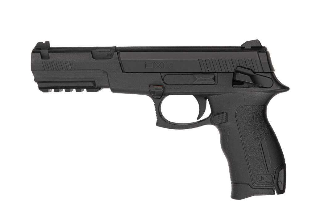 Пневматичний пістолет Umarex DX17 - ідеальний пневматичний пістолет для розважального Плінка. Як джерело енергії використовується кручена пружина і стріляє він як однією свинцевою кулею кал .177 так і має зручний вбудований резервуар на 15 кульок BB. У DX17 є вбудована планка Пикатинни для кріплення лазерного целевказівника або ліхтаря, оптоволоконна мушка і ергономічно зручне руків'я. Зазубрений слайд дозволяє легко брати і зводити пружину, а відкидний завантажувальний порт спрощує завантаження кульок BB.