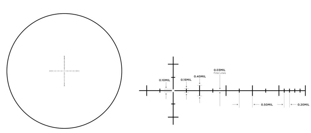 Зорова труба має оптичну систему професійного рівня і забезпечує неперевершене світлопропускання, що дозволяє працювати в найскладніших умовах освітлення. Провідне в галузі зниження відблисків забезпечує чітке зображення при різкому прямому освітленні, а роздільна здатність і чіткість задовольнять вимоги будь-якого професіонала, що працює в польових умовах. Прицільна марка TMR є удосконаленням існуючої конструкції сітки MIL Dot. Замість точок використовуються поділки для підвищення точності вимірювання дальності. Розподіл розташовуються на відстані 0,5 MIL один від одного, переходячи на відстань 0,2 MIL на зовнішніх краях сітки. Дана сітка не має прив'язки до певного калібру. Системи з урахуванням MIL є поточним військовим стандартом. Сітка розміщена у першій фокальній площині.