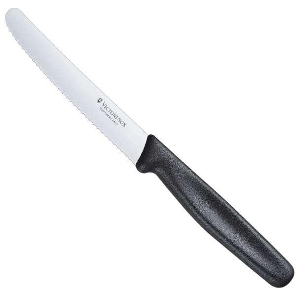 Компактний і зручний кухонний ніж для нарізки помідорів та сосисок від швейцарської компанії Victorinox. Володіє серрейторной заточуванням (зубцями) і заокругленим кінчиком, що дозволяє вам легко і комфортно справлятися з нарізкою навіть самих стиглих овочів, не перетворюючи їх в кашку, а також максимально тонко нарізати м'ясні продукти, практично як на слайсери. Серія: "Standart" Кухонні ножі Victorinox - це вироби високої якості, які повністю відповідають всім вимогам міжнародних стандартів. В асортименті компанії є будь-які різновиди кухонних ножів - обробні, ножі для очищення картоплі, для нарізання риби і сиру, для хліба, а також клинки інших типів. Ножі Victorinox зроблені з якісних матеріалів. Леза з надміцної сталі довго зберігають свою гостроту, а ручки з пластика, дерева і металу володіють підвищеною комфортністю. Завдяки цьому, кухонними ножами Victorinox можна працювати протягом тривалого часу, не втомлюючись. Рекомендації по експлуатації: Високоякісні кухонні ножі не рекомендується мити в посудомийній машині. По ряду причин виробники ножів рекомендують виключно ручну мийку. Відразу після використання ножі повинні бути вимиті вручну і висушені, в іншому випадку леза ножів можуть потемніти. У разі якщо з'явилися невеликі зміни відтінку стали або плями на лезі - використовуйте для очищення тільки м'які які містять хлор або абразиви кошти. Ножі найкраще зберігати окремо від решти посуду, так як це допоможе уникнути можливих пошкоджень ріжучої кромки і полотна леза від сторонніх контактів з твердими предметами (не зберігайте ножі в традиційному висувному кухонному ящику упереміш один з одним). Найкраще їх тримати в спеціальній підставці або на магнітному тримачі. Кухонні ножі не призначені для різання і рубки м'яса, птиці та риби з великої кісткою, а так само заморожених продуктів (для цих цілей існують спеціальні ножі). Ножі не потрібно згинати, гнути чи використовувати для скобления, дряпання, відкривання пивних пляшок або консервів. Не рекомендується різати продукти на обробних столах і дошках зі скла, кераміки, натурального каменю, акрилу. Використовуйте дошки з натурального дерева або поліуретану (м'якої пластмаси). При правильній експлуатації якісні кухонні ножі прослужать вам довгі роки.