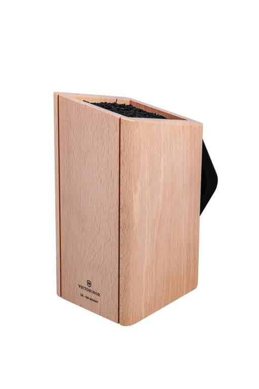 Подставка для кухонных ножей из натурального дерева с чёрной нейлоновой ручкой Victirinox. Очень удобна, функциональна и занимает минимум места на вашей кухне. Конструкция подставки предусматривает вертикальное и наклонное положения. Внутренний нейлоновый наполнитель препятствует образованию плесени и коррозии ножей.