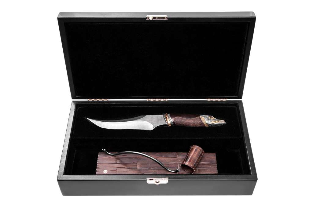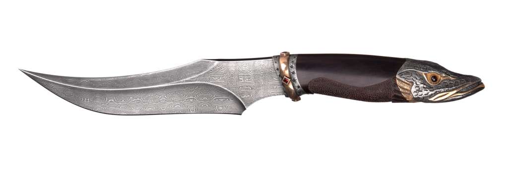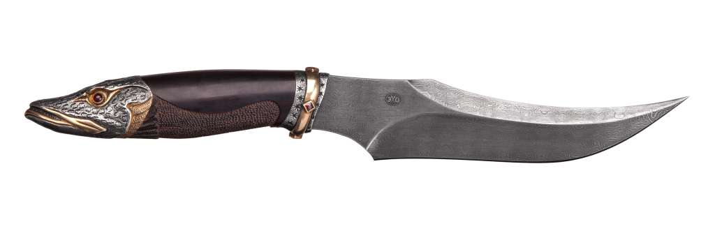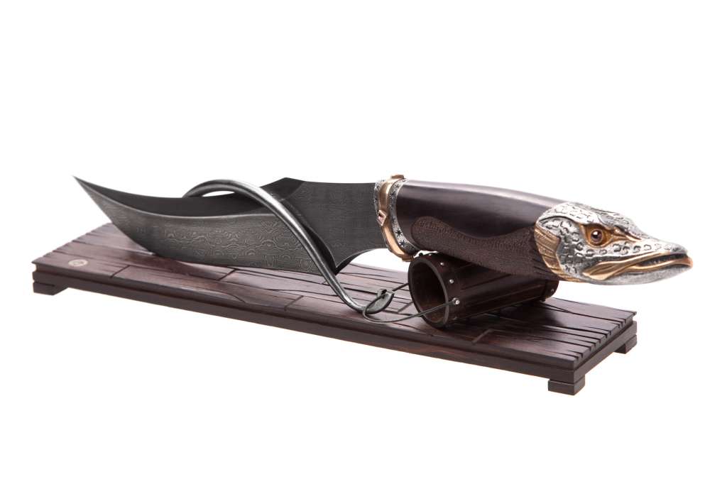 Нож " Емеля " выполнен творческим коллективом мастерской - студии "Э.Х.О." г. Санкт - Петербурга. Для художественного оформления клинка и рукояти могут быть использованы различные методы и технологии декоративной обработки материалов. Клинок изогнутый вверх , двулезвиный (угол зоточки 25* - 30*). Материал клинка - дамасская сталь ( возможно изготовление из булатной и других сталей). Крепление хвостика осуществляется гайкой, расположенной под навершием , которое представляет собой литую голову щуки . Рукоять точёной формы изготавливается из ценных пород дерева. Навершие гарда изготовлено из бронзы с последующем гальваническим серебрением. Конструкция рукояти не обеспечивает безопасность руки при нанесении колющих ударов, но не допускает травмирования при целевом использовании ножа ( при разделке ). Общая длина - 270 мм. Длина клинка - 145 мм. Длина рукояти - 125 мм. Толщина клинка - 6 мм. Ширина клинка - 30 мм. Твёрдость клинка, HRC - 60 Дизайн : К. Кривопуск, Гал Марат. Дамасская сталь : С. Бобков. Дизайн полставки : И, Ширман.