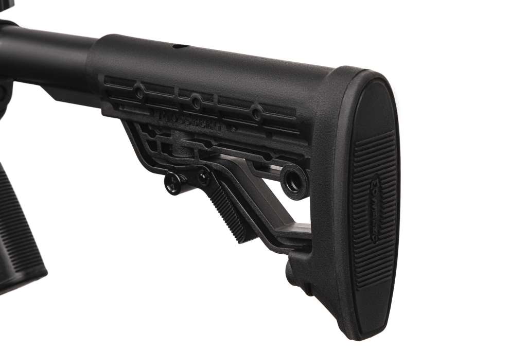 Карабін Mossberg MMR Pro Rifle забезпечений регульованим по довжині телескопічним гумовим прикладом, перфорованою цівкою з направляючими Picatinny та ергономічним руків’ям управління вогнем зі збільшеною спусковою скобою.