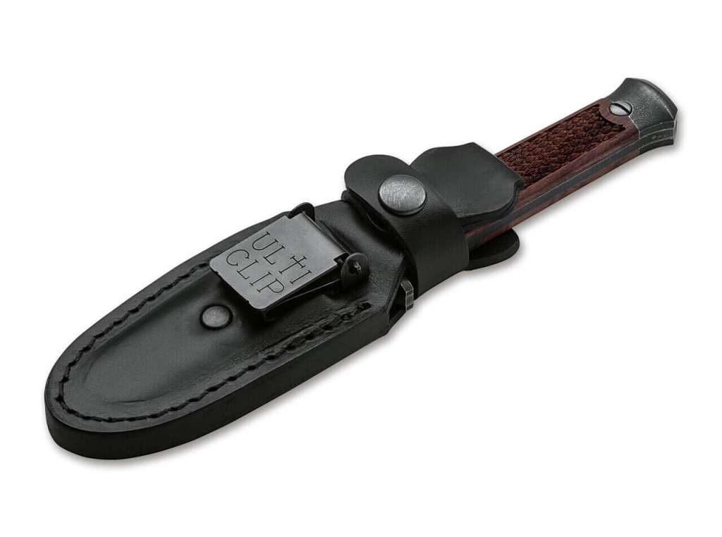 Больстер і навершя виготовлені зі сталі і оброблені за технологією black stonewash ( "каменеструй"). Поставляється в високоякісних шкіряних піхвах чорного кольору з вшитим затискачем Ulticlip, який легко прикріплюється за допомогою фіксуючого пружинного механізму. Кинджал Böker P08 Damascus можна легко витягти з піхов, а Ulticlip надійно утримує піхви на місці.