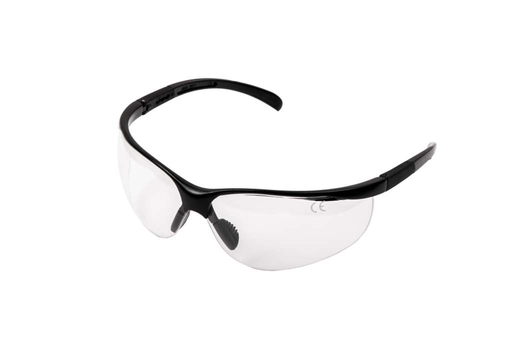 Захисні окуляри "Combat Zone SG1" в чорній оправі, з прозорими лінзами і захистом від ультра-фіолетового випромінювання.