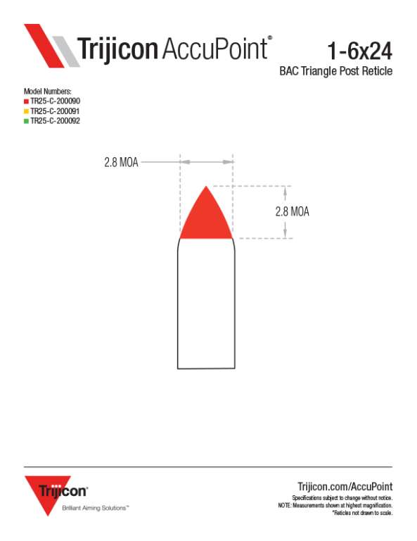 Trijicon AccuPoint 1-6x24 буде прицілом, який дасть вам невелике додаткове збільшення, коли воно вам знадобиться. Після використання карабіна весь день на 1x ви досягаєте тієї стадії, коли вам потрібно зупинитися, подихати і зробити дальній постріл. Коли ви це зробите, ви будете раді, що зможете збільшити його до 6 разів. Будь то густий ліс зліва від вас або кукурудзяне поле праворуч від вас, у вас буде впевненість, щоб вистрілити. Наша запатентована сітка на оптоволоконної основі - одна з найшвидших, які ви коли-небудь використовували. Використовуйте функцію Bindon Aiming Concept ™ (BAC) Trijicon з відкритими очима, вирівняйте кінчик яскравого оптоволоконного трикутника з ціллю, натисніть на спусковий гачок, і ваша робота буде виконана. Керуйте яскравістю своєї оптоволоконної точки прицілювання за допомогою інноваційної шкали підсвічування і будьте впевнені в правильності пострілу при слабкому освітленні, коли працює тритій.