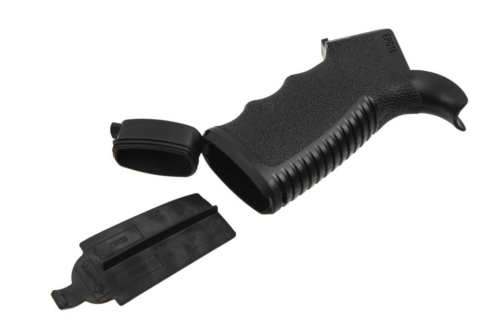 Пістолетна рукоятка EPG16-BL виконана у чорному кольорі з високоякісного полімеру. Випуклості для пальців текстуровані, а задня рифлена поверхня рукоятки забезпечують надійне зчеплення з мокрими руками або руками в рукавичках. Безпечний водонепроникний відсік для зберігання аксесуарів розташований усередині ручки. Закривається відсік за допомогою клямки, яку легко можна відкрити однією рукою. Кут нахилу складає 25 градусів.