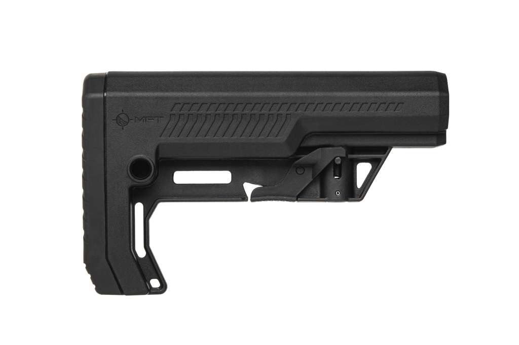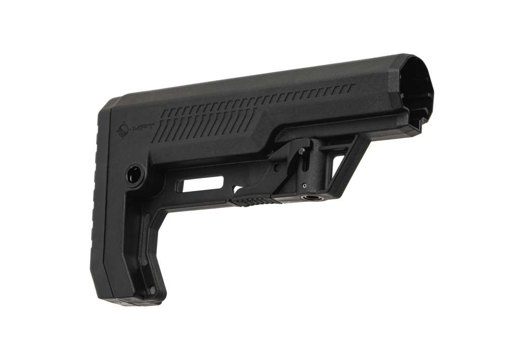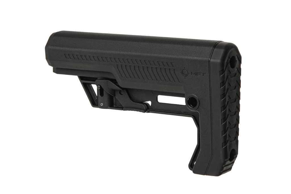 Приклад MFT Battlelink™ Extreme Duty Minimalist створено на основі популярної платформи Minimalist Stock. Приклад створений на підставі потреби в більш надійному прикладі, здатному витримувати тривалий вплив вогнепальної зброї більшого калібру, такого як тактичні дробовики 12 калібру або 7,62x51 AR-10, і при цьому залишатися достатньо маневреним для використання з 5,56-мм. • Виготовлений із міцного полімеру розробки Dupont's Military Plastic Division • Похилий нековзний прогумований знімний потиличник забезпечує надійну фіксацію прикладу при стрільбі • Кріплення під швидкознімну QD антабку для ременя • Призначений для установки на буферну трубу Mil Spec.