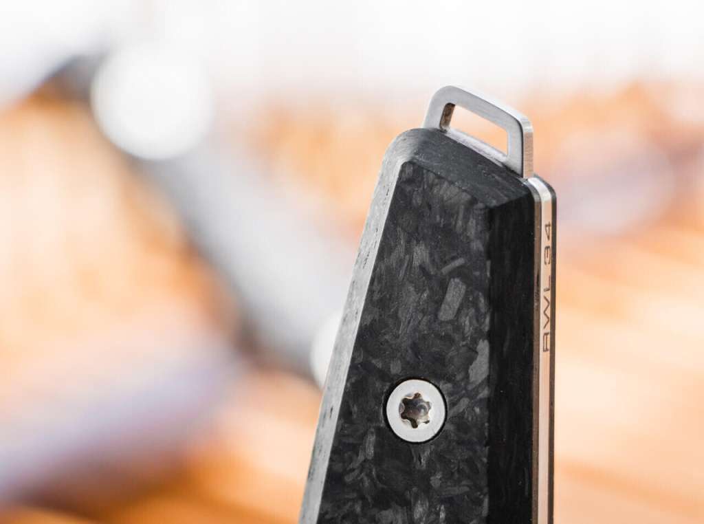 Накладки рукояті ергономічної форми виготовлені із вуглецевого волокна, та їх зручно тримати в руці. Їх можна легко демонтувати за допомогою ключа Torx, що додається, а також замінити широким спектром альтернативних накладок, розроблених і вироблених спільно з Daily Customs. Крім того, хитро виготовлений отвір для темляка на кінці рукоятки можна повернути при демонтажі накладок рукоятки, щоб він зник усередині рукояті.