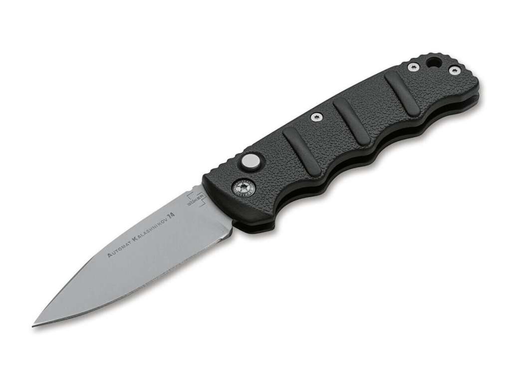 Бокер Плюс АКС-74 із серії Калашникова, безумовно, є однією з найпопулярніших моделей у нашому асортименті і протягом багатьох років випускалася в багатьох різних варіантах. Чорна алюмінієва рукоятка сильно нагадує багнет знаменитої штурмової гвинтівки, а рельєфні фактурні канавки також забезпечують надійне захоплення в будь-якій ситуації. Лезо, що оброблено, виготовлено з нержавіючої сталі D2 і може бути закріплено за допомогою ковзаючого замка на додаток до кнопки. З отвором для шнурка та практичною кліпсою (tip-up/r).