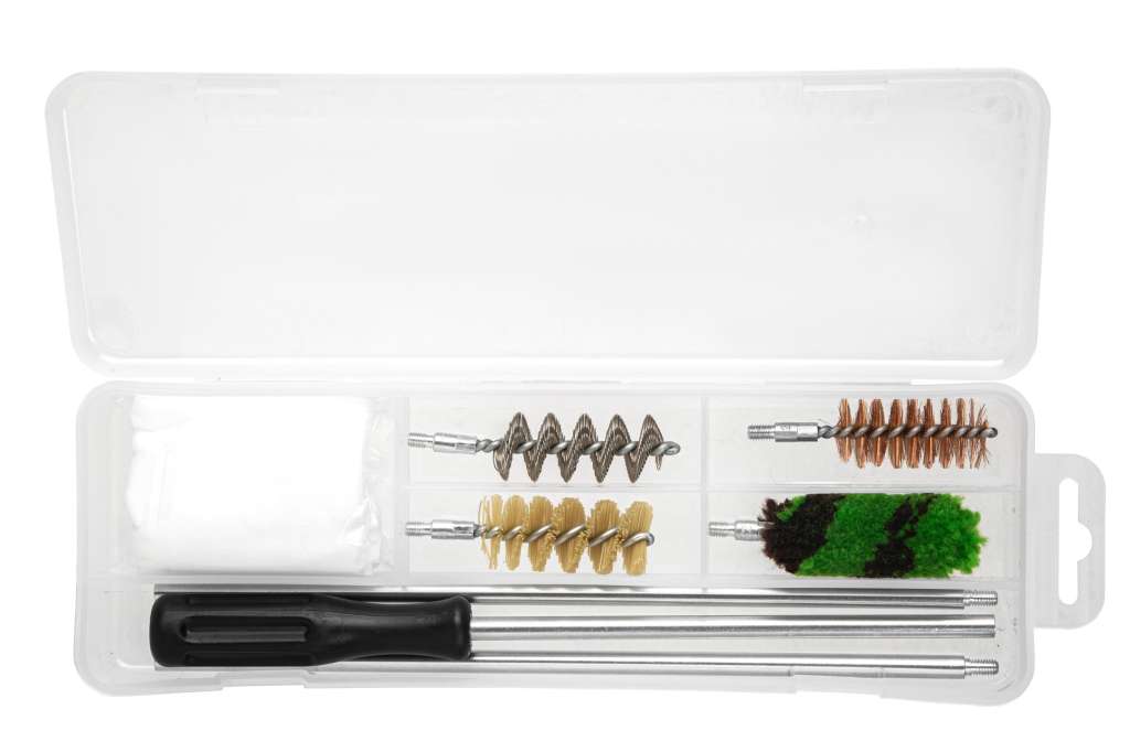Состав набора: - шомпол с пластиковой ручкой и тремя насадками - ёрш нейлоновый - ёрш спиральный - ёрш медный - пуховка - салфетка - пластиковая коробка