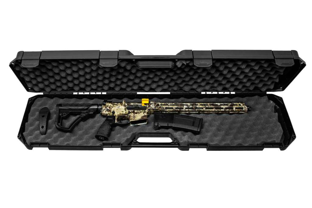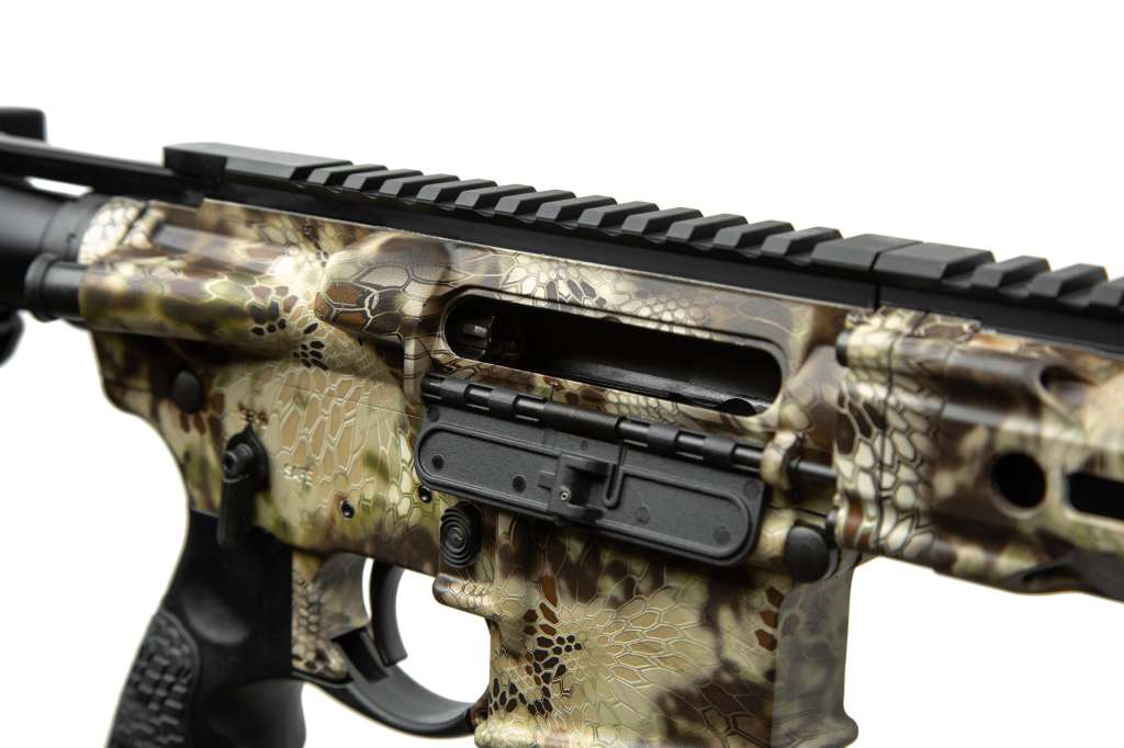 Модель Hunter оснащена прикладом і пістолетним руків'ям виробництва Daniel Defense і пофарбована в яскравий камуфляжний малюнок Kryptek Highlander з водовідштовхувальним просоченням.