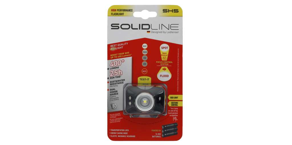 LED Lenser Solidline SH5 – одна з найлегших моделей лобових ліхтарів: важить 86 грамів. Він зручний і легкий у носінні, при цьому досить яскравий і надійний. У нього два світлодіоди: білий та червоний, а режимів роботи – 5. Максимальний світловий потік – 350 Лм. Світловий промінь можна не тільки перемикати з широкого на вузький, але й направляти у певне місце завдяки рухомій конструкції голови ліхтаря. Кут нахилу складає 60 градусів. Головні фішки цього ліхтаря – це те, що можна керувати за допомогою жестів, а кнопку можна заблокувати від випадкового натискання при транспортуванні. Крім того, його корпус захищений від проникнення пилу та бризок води за стандартом IP54. Працює ліхтар від батарей AAA, але батарейний блок розрахований на використання як батарей, так і акумуляторів.