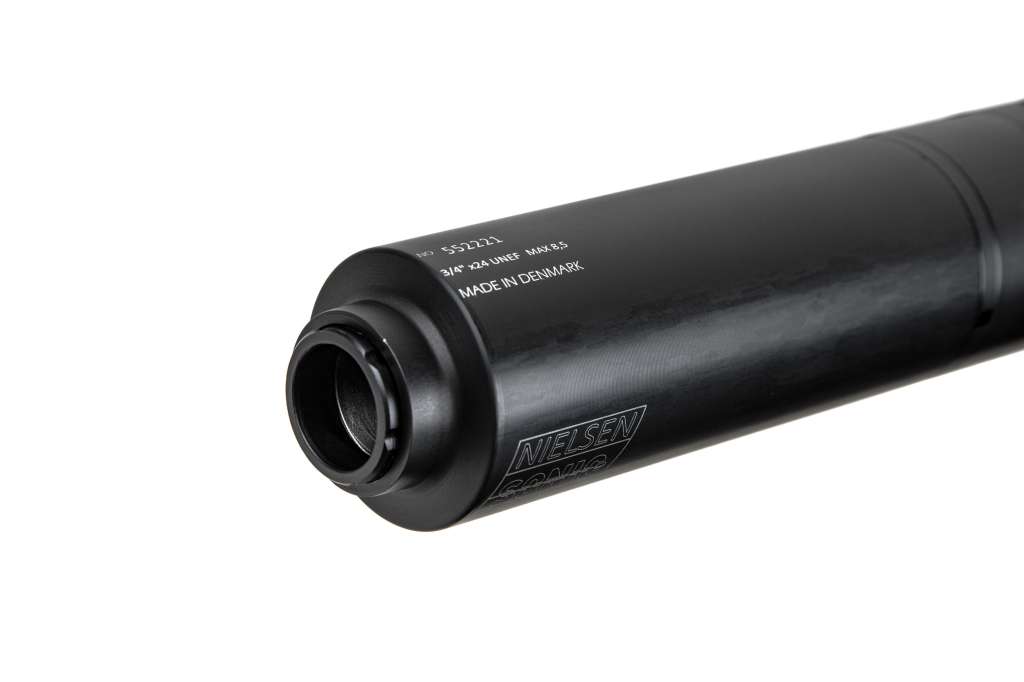При виборі глушника важливо, щоб Ви вибрали відповідний калібру, який Ви використовуєте. Sonic 55 – найбільший глушник в асортименті датського бренду Nielsen. Sonic 55 призначений для найбільших калібрів і тих, хто хоче найкращого зниження рівня шуму. Sonic 55 без проблем працює з .338 Lapua Magnum. Саундмодератор Sonic 55 3/4x24 Max 8,5 відмінно підходить для нарізних карабінів Ruger .338 LM та Barrett MRAD .338 LM. Sonic 55 3/4x24 Max 8,5 - не інтегрований саундмодератор.
