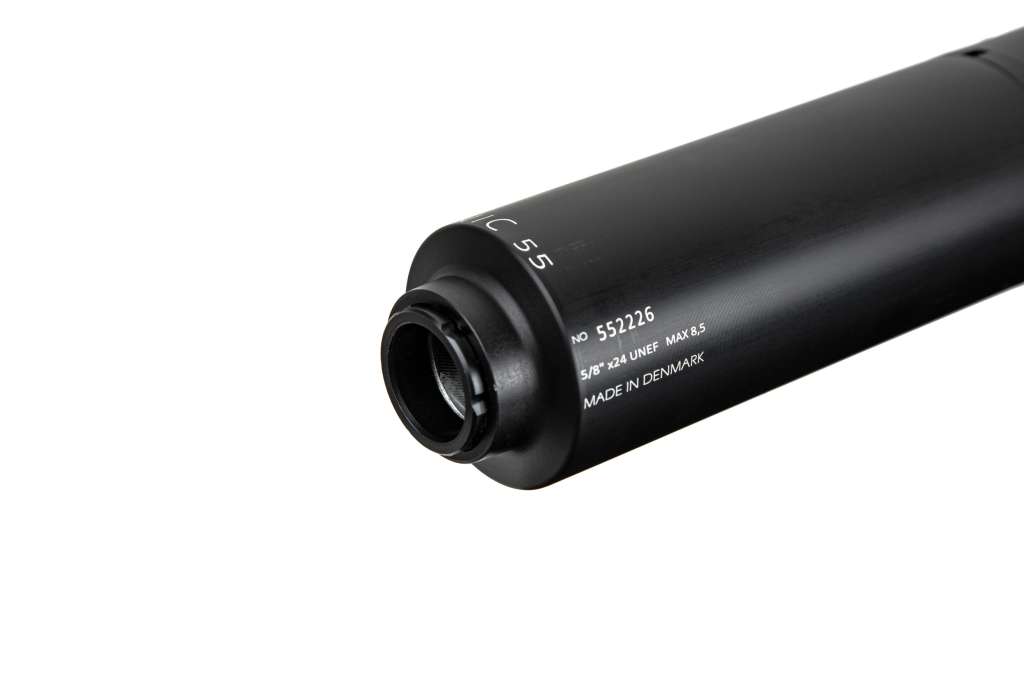 При виборі глушника важливо, щоб Ви вибрали відповідний калібру, який Ви використовуєте. Sonic 55 – найбільший глушник в асортименті датського бренду Nielsen. Sonic 55 призначений для найбільших калібрів і тих, хто хоче найкращого зниження рівня шуму. Sonic 55 без проблем працює з .338 Lapua Magnum. Саундмодератор Sonic 55 5/8x24 Max 8,5 ідеально підходить для карабінів Christensen Arms MPR FFT 338 Lapua з різьбленням 5/8x24. Sonic 55 5/8x24 - інтегрований саундмодератор, в якому ствол заходить на 13 см.