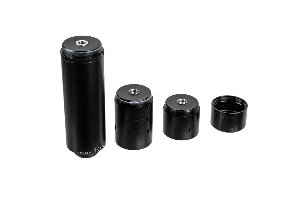 Nielsen Sonic - це оригінальна модель глушника Nielsen, в якій основна увага приділяється довговічності та універсальності. Саундмодератор Sonic має виїмки зовні, щоб його можна було легко відокремити за допомогою інструмента для обслуговування або зміни довжини глушника. Завдяки своєму великому об'єму, глушник Sonic 55 забезпечує максимальне зниження рівня шуму в децибелах на великих калібрах.