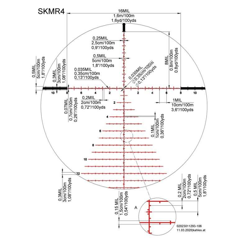 - Кількість горизонтальних смуг збільшено порівняно зі SKMR3 з 12 до 15 збільшення дальності стрільби. Відстань між горизонтальними смужками маркерів підтримується кроком 0,5 MIL. Мітки для поправок на вітер на горизонтальних смугах тепер суцільні, а не порожні для кращої видимості.