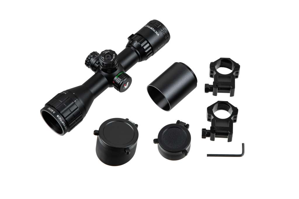 Приціл виготовлений із високоякісного алюмінієвого сплаву з міцним чорним матовим покриттям. Комплект прицілу включає відкидні кришки, кільця Вівер діаметром 25,4 мм з високим профілем, антивідблискову бленду, серветку для обслуговування оптики.