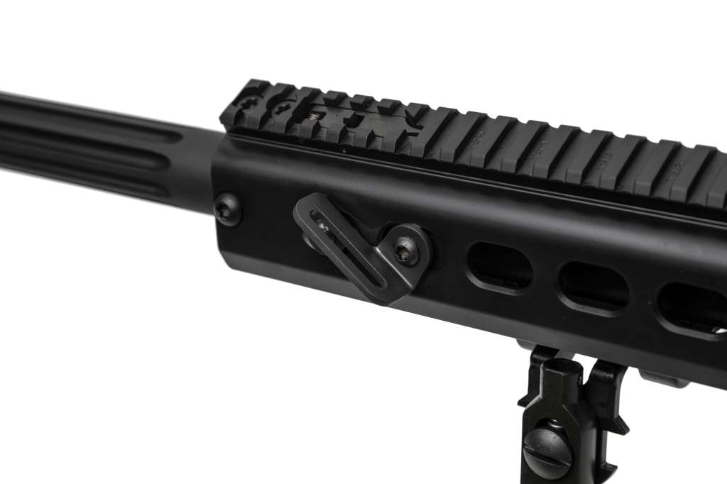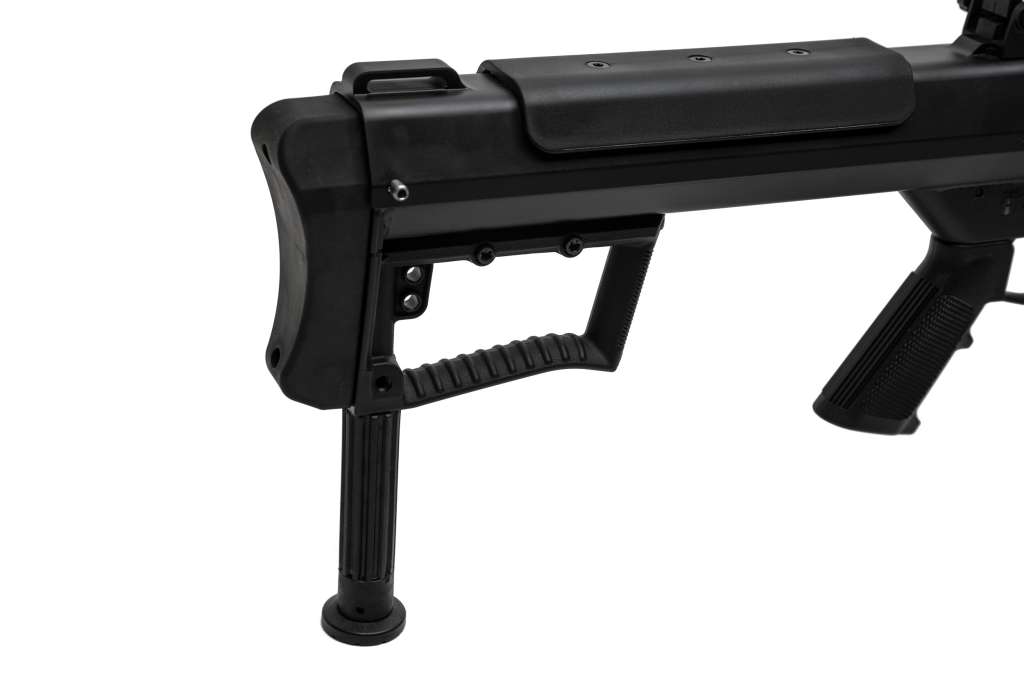 Приклад оснащений щокою, що служить в якості термозахисту обличчя стрілка. Руків'я на прикладі з модульною напрямною, встановлене на напрямній M1913, дозволяє використовувати монопод.